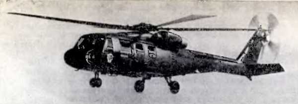 «Hue Cobra» За время своего развития общий вес, количество пассажиров и дальность полета вертолета «Хью» увеличились почти в три раза (соответственно от 3270 кг, 6 пассажиров и 274 кг на UH- 1А до 7938 кг, 18 пассажиров и 805 кг на 214ST). Ранние модели вертолетов «Хью» — однодвигательные, а более поздние (Белл 212, UH-1N, 412 и 214ST) — двухдвигательные. Двигатели размещены по схеме, впоследствии ставшей классической, т.е. горизонтально — над задней кабиной и соединены с несущим винтом через редуктор трансмиссии. Большинство модификаций вертолета UH-1 могут перевозиться на транспортных самолетах типа С-124. Все вооружение вертолетов огневой поддержки «Хью» съемное. Для его установки вертолет оборудован пятью встроенными и двумя навесными точками крепления. Встроенные точки крепления расположены с боков кабины и в носовой части фюзеляжа. Навесные узлы крепления размещены в дверных проемах задней кабины. На всех точках крепления могут быть установлены пулеметы или гранатометы. Первый полет нового вертолета состоялся 19 декабря 1961г. В 1962 году этот вертолет был переименован в СН-47А. Вначале на нем были установлены два двигателя ГТД Т-55 мощностью 1641 кВт фирмы Лайкоминг, которые затем были заменены двигателями Т-55 мощностью 2797 кВт. Цельнометаллический фюзеляж СН-47D имеет прямоугольное сечение со скругленными углами. С каждой стороны нижней части фюзеляжа расположены обтекатели, скрывающие по три топливных бака общей емкостью 3944 литра. В грузовой кабине объемом 40,78 кубометра могут быть размещены 33 основных и 11 дополнительных сидений для десантников. Кроме того, предусмотрены узлы крепления носилок для 24 раненых. Откинутая створка грузового люка образует погрузочную рампу. Лопасти крепятся к несущим винтам посредством шарниров. Для снижения абразивного износа, носок лопасти покрыт обшивкой из титановых и никелевых сплавов. Двигатели, установленные с каждой стороны пилона заднего несущего винта, снабжены осевыми воздухозаборниками, затянутыми сетчатыми экранами. CH-53А «Stelion» Первый полет вертолета CH-53 состоялся 14 октября 1964г. Вертолет снабжен поплавками для посадки на воду и имеется возможность загрузки через задний грузовой люк на плаву. Лонжероны лопастей несущего винта сделаны на основе титанового сплава. Лопасти изготовлены таким образом, что могут складываться вдоль, фюзеляжа в сторону рулевого винта. Это существенно упрощает размещение вертолетов в ангарах авианесущих кораблей. ДвигательТ64-GЕ-6 выполнен со свободной турбиной, как у советских вертолетов. В состав силовой установки входит турбостартер, который приводит в действие гидравлическую систему и осуществляет запуск двигателей. Шасси убирается внутрь вертолета и имеет три стойки. Первые вертолеты серии СН-53А «Стэллион» состояли на вооружении в корпусе морской пехоты и обычно перевозили 38 десантников или 24 раненых на носилках. Модифицированный вертолет RH-53A «Си Стэллион» использовался как минный тральщик. Вертолет UH-60 «Блэк Хок» появился в 1974г в результате осуществления правительственной программы США UTTAS.Вертолет оснащен бронированными сидениями экипажа и пассажиров (11 десантников). Усилено крепление двигателей и главного редуктора. Стойки шасси имеют двухкамерные амортизаторы. При аварийном ударе о землю автоматически включается система пожаротушения. Имеются сигнализаторы по